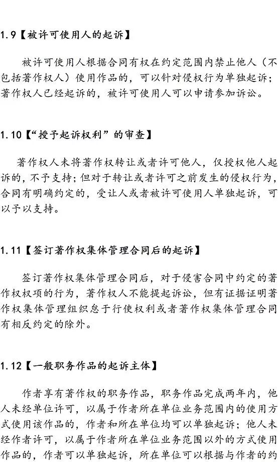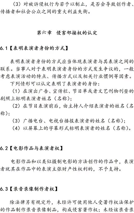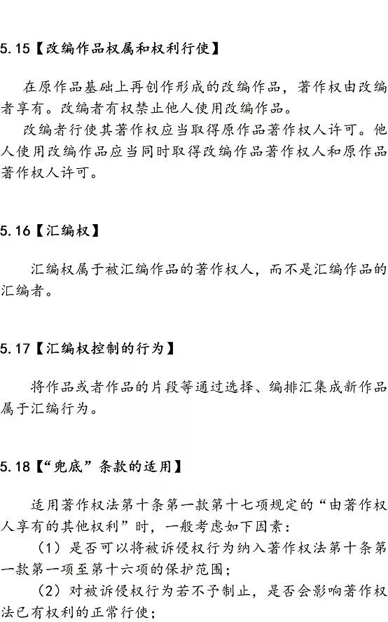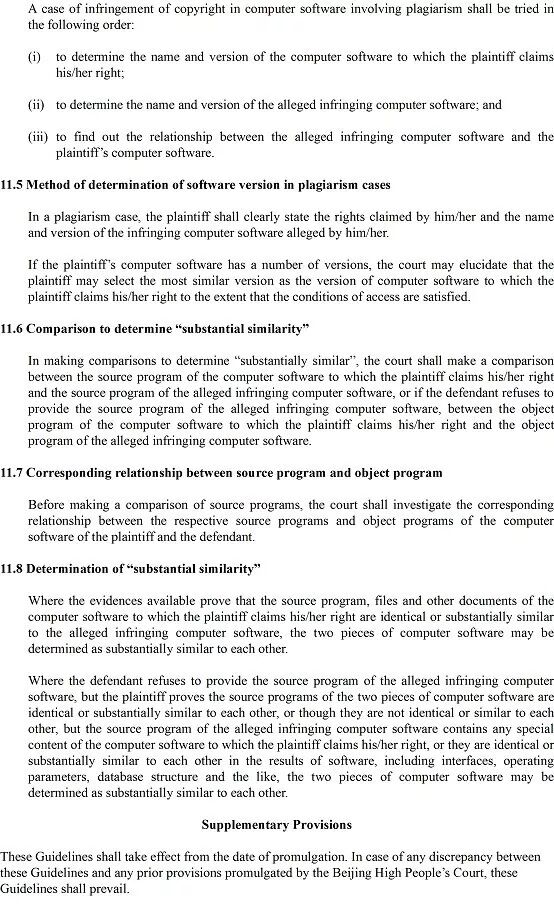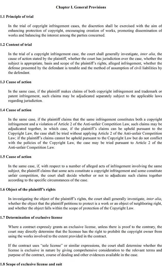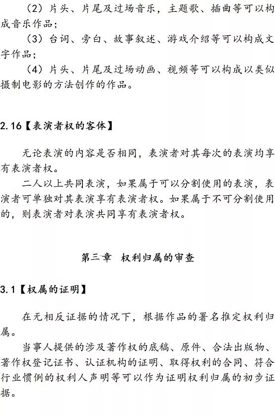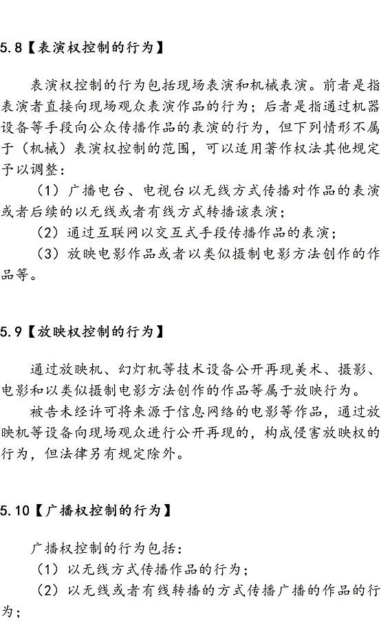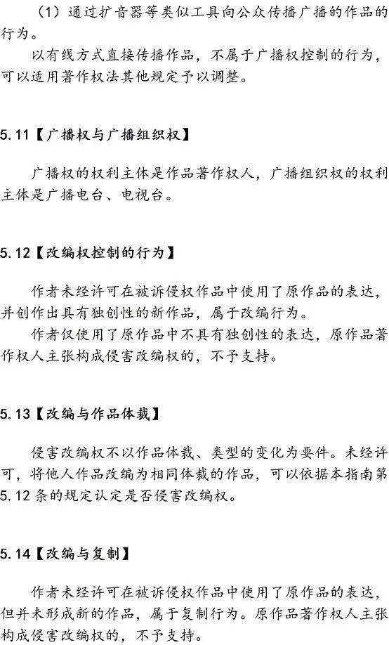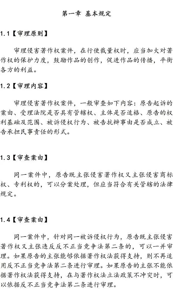 《指南》全文分为11个部分,共计160条,涉及基本规定、权利客体、权利归属、侵权认定(包括著作人身权、著作财产权、邻接权)、抗辩事由、法律责任、侵害信息网络传播权的认定、侵害影视作品著作权的认定、侵害计算机软件著作权的认定等11个方面的问题。