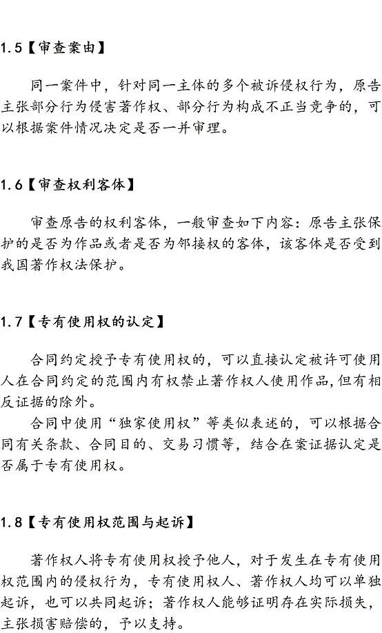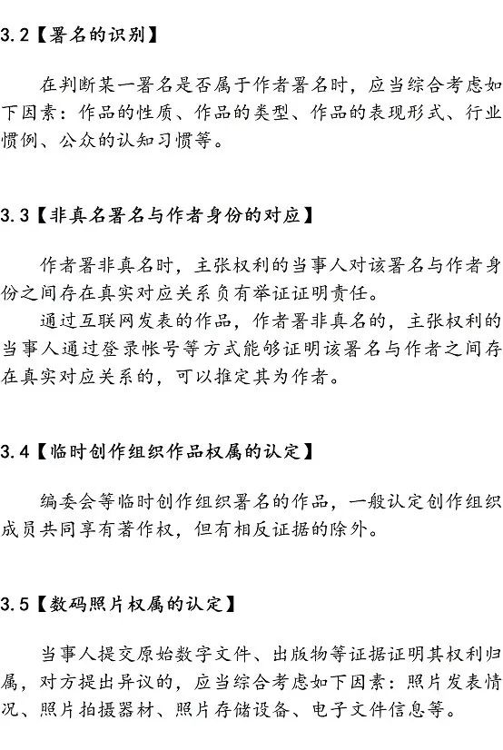 据北京市高级人民法院民三庭庭长助理潘伟介绍,《指南》的主要内容为:一是明确案件的审理原则,总结案件的审理思路,提出了“加大保护、鼓励创作、促进传播、平衡利益”的基本审理原则,并对侵害著作权案件程序问题审查、诉权行使方式及实体问题审理的规范思路进行总结;二是规范客体审查标准,统一署名的认定规则,《指南》明确提出了作品审查的四要件,针对著作权案件近年来的新情况予以回应,厘清了互联网技术发展下的署名认定规则;三是界定权利保护范围,提出类案的审理规则,对侵害著作人身权、著作财产权以及邻接权的认定作出具体规定,并确定了实践中常见的侵害著作权案件的审理思路;四是加大权利保护力度,探索惩罚性赔偿机制,细化了损害赔偿的适用方法和计算依据,回应了赔偿数额“举证难”的问题,并针对“恶意侵权”行为提出惩罚性赔偿的思路。